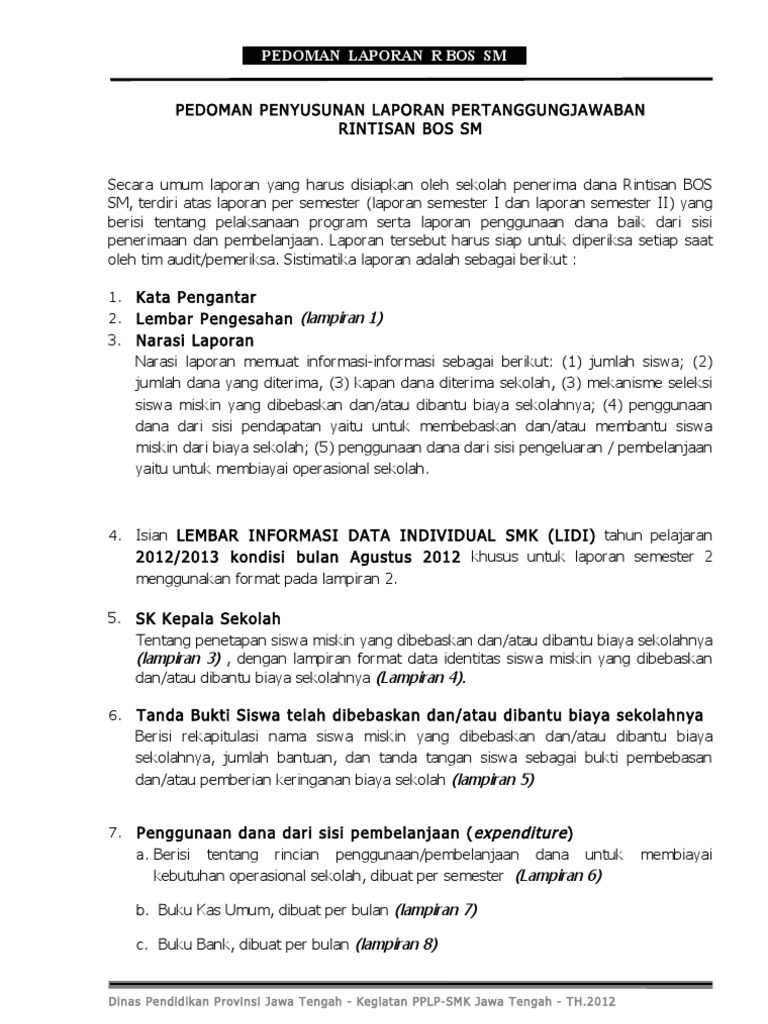 Contoh laporan pertanggungjawaban dana bos 2017. Contoh laporan bos sesuai juknis bos 2018 2019 lengkap. Meskipun penggunaan dana bos dilaporkan secara online tetapi tetap sumber laporannya berasal rekapitulasi yakni pada laporan bos k7 laporan k7a online pada porta boskemdikbudgoid. Membahas tentang bantuan dana operasional non personalia memang merupakan tugas yang cukup berat apalagi buat pihak pengelola dimana anda harus mengelola mendata sereta merinci secara detail setiap penggunaan atau pembiayaan yang dikeluarkan. Sekian mengenai suatu contoh laporan pertanggungjawaban dana bos 2017 kami bagikan beberapa kumpulan berkas nya diharapkan mampu memenuhi kebutuhan pihak bendahara dalam mengatur serta mengelola dana keuangan yang bersumber dari bantuan operasional sekolah. Tentu rekan bendaharawan semua sekarang tidak lagi membuat laporan. Sekian penyampaian artikel hari ini semoga bermanfaat.