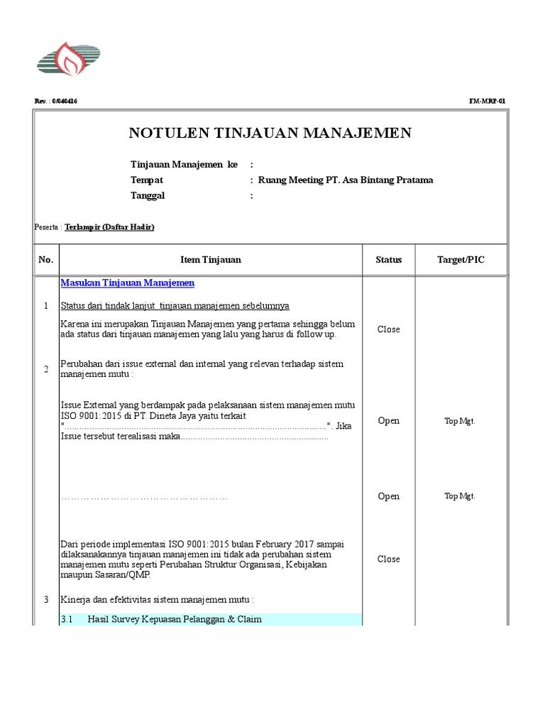 Admin blog seputar laporan 2019 juga mengumpulkan gambar gambar lainnya terkait contoh laporan rapat tinjauan manajemen iso 9001 dibawah ini. Agenda rapat management review 1. Tinjauan manajemen iso 9001. Contoh pembahasan agenda ini antara lain perihal budget tentang infrastruktur yang diperlukan kecukupan sumber daya manusia lingkungan kerja alat alat ukur misalnya kalibrasi lihat iso 90012015 poin 71. Tindak lanjut management review yang lalu. Rapat tinjauan manajemen rtm rapat tinjauan manajemen management review meeting pada hakikatnya merupakan salah satu kegiatan wajib yang mesti dilakukan suatu institusiperguruan tinggi yang sudah atau baru mulai menerapkan melaksanakan sistem penjaminan mutu internal spmi.