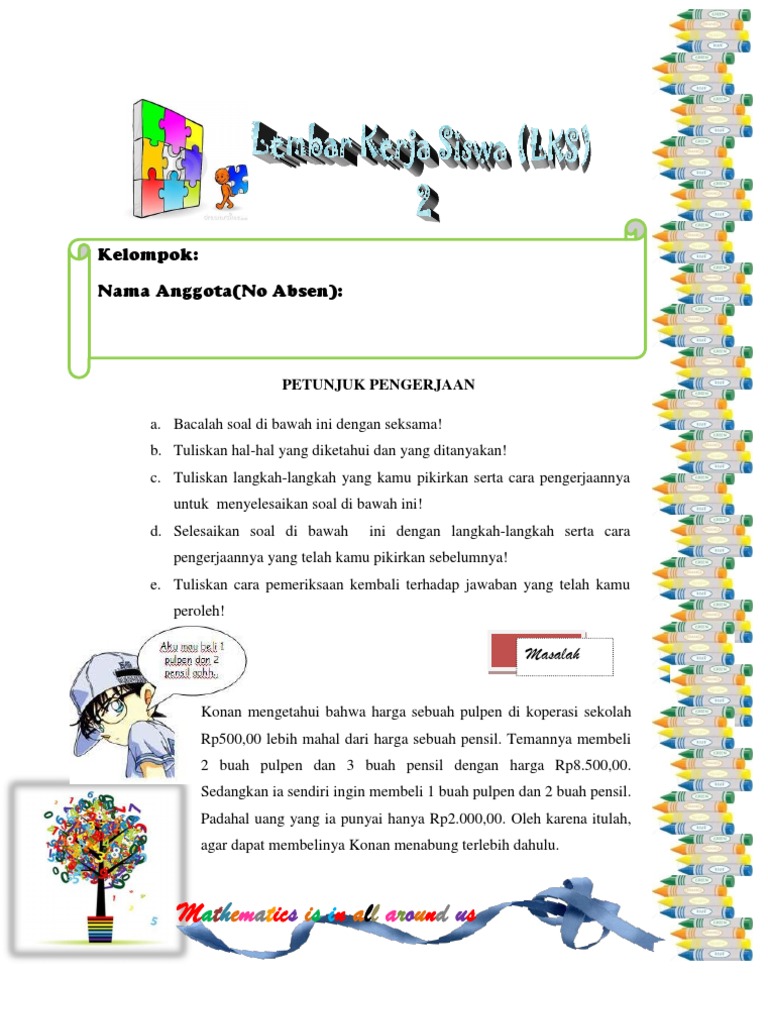 Contoh lembar kerja siswa yang menarik. Lks merupakan alat bantu mengajar yang dapat dipakai untuk mempercepat pembelajaran memberi dorongan belajar pada tiap individu berisi sedikit petunjuk tertulis atau lisan untuk mengarahkan kerja pada peserta didik. Sementara penilaian merupakan lembaran yang diisi guru. Contoh lembar kerja siswa lks adalah suatu lembaran berupa kertas yang berisikan tugas tugas atau soal soal yang ditujukan untuk dikerjakan oleh siswa. Contoh lembar kerja siswa lks yang sekarang berubah nama menjadi lembar kerja peserta didik lkpddefinisi dan pengertian lembar kerja siswa lks wawasan edukasi jika melihat dari penamaannya lks adalah suatu lembaran berupa kertas yang berisikan tugas tugas atau soal soal yang ditujukan. Contoh lkpd kurikulum 2013. Contoh lembar kerja siswa lembar kerja siswa lks merupakan panduan siswa yang digunakan untuk melakukan kegiatan penyelidikan atau penyelesaian masalah.