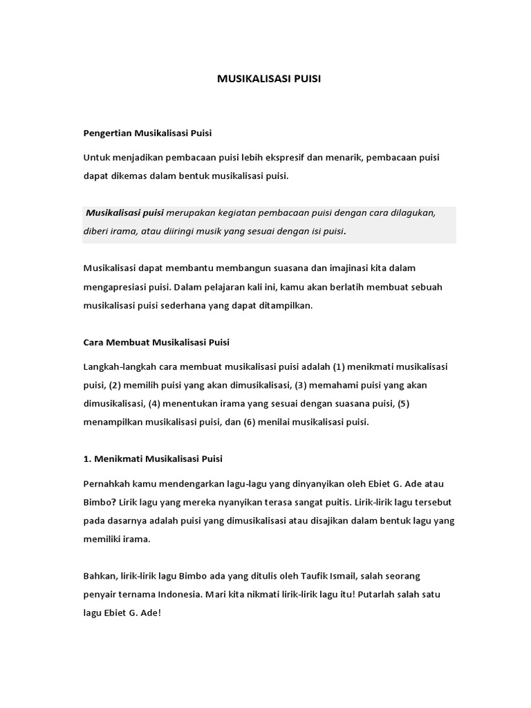 Contoh lirik musikalisasi puisi. Bentuk musikalisasi puisi irangan ialah model puisi yang terfokus pada iringan permainan alat alat musik. Musikalisasi puisi dengan teknik membuat komposisi lagu dimana syair puisi menjadi lirik lagu. Puisi untuk musikalisasi puisi lagu kepompong sahabat dulu kita berteman sahabat sangat erat coba hilangkan perbedaan dulu kita berteman sahabt sejak kecil berharap sampai dewasa saat ini kita mulai meregang kau pergi dariku karna kekasihmu mungkin dirimu tlah bersikap kejauhan. Contoh musikalisasi puisi halo sobat disiniaja yang berbahagia. Jenis musikalisasi p uisi t erapan merupakan musikalisasi puisi yang mana syair syair puisi diterapkan menjadi lirik lagu sebagaimana halnya lagu lagu populer pada umumnya. Menggabungkan dua karya senimusik dan puisiterbukti memberikan sentuhan baru dalam dunia seni.