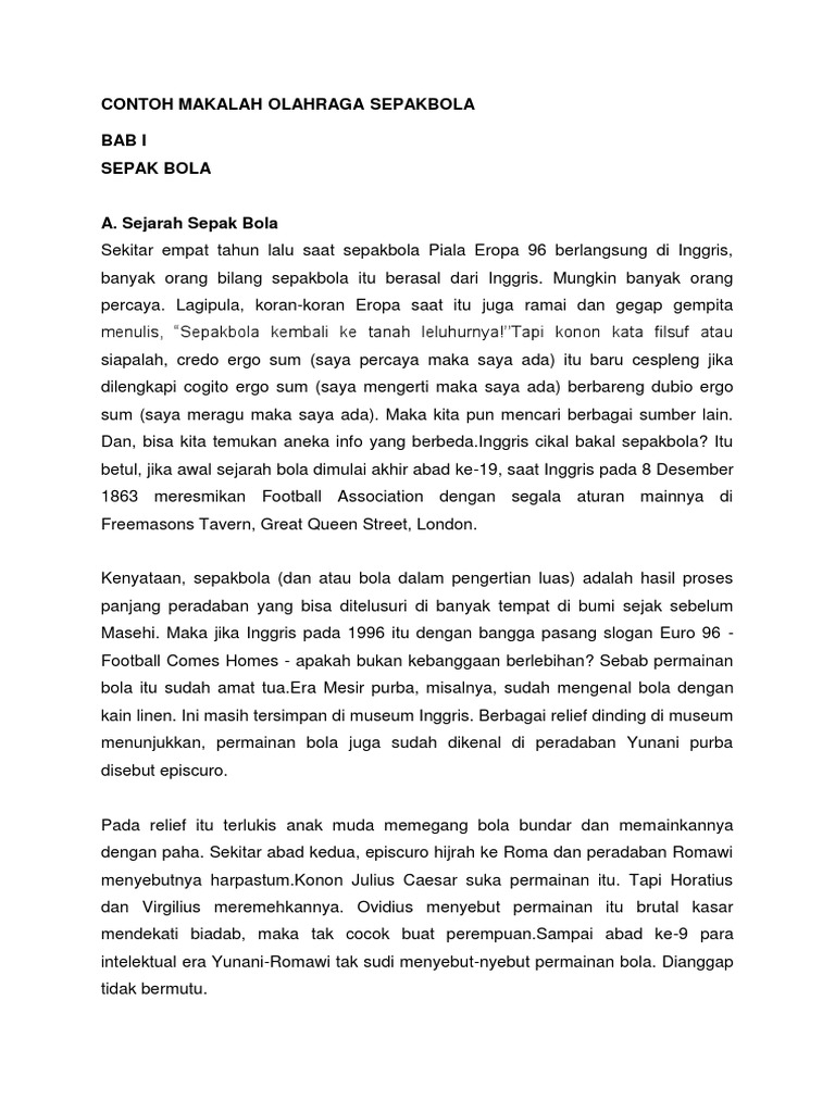 Contoh makalah sepak bola. Dan beberapa orang pemain inti dan beberapa pemain cadangan tujuan dari permainan sepak bola yaitu memasukan bola ke gawang lawan. Sepak bola adalah olahraga menggunakan bola yang dimainkan oleh dua tim yang masing masing beranggotakan 11 sebelas orang. Awalnya ini hanya untuk pemain pemain amatir saja namun sejak olimpiade los angeles 1984 pemain profesional juga mulai ikut bermain disertai peraturan yang mencegah negara negara daripada memainkan tim terkuat mereka. Bersamaan dengan itu terjadi pemisahan yang jelas antara olahraga rugby dengan sepak bola soccer. Peraturan permainan sepak bola alapangan sepak bola bentuk lapangan lapangan sepak bola berbentuk empat persegi panjang dengan panjang antara 918m 120m lebarnya antara 469m 918 untuk petandingan internasional panjang lapangan antara 100m 110m danlebarnya antara 6426m 7344m. Pada tahun 1869 membawa bola dengan tangan mulai dilarang dalam sepak bola.