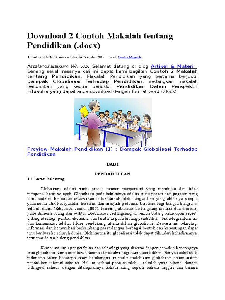 Berikut ini adalah salah satu contoh makalah karya ilmiah tentang pendidikan terbaru tentang dampak globalisasi terhadap pendidikan 2017 yang dapat kamu download secara gratis. Makalah dituangkan dengan bahasa yang baik dan benar dan sesuai dengan aturan eyd. Dan jika ada kekurangan dari contoh makalah ini saya mohon maaf dan silahkan berkomentar tentunya komentar yang sifatnya membangun dan sesuai dengan tema artikel. Pendidikan merupakan faktor utama dalam pembentukkan pribadi manusia. Karakter adalah jawaban mutlak untuk menciptakan kehidupan yang lebih baik didalam masyarakat. Karakter merupakan nilai nilai perilaku manusia yang berhubungan dengan tuhan yang maha esa diri sendiri sesama manusia lingkungan dan kebangsaan yang terwujud dalam pikiran sikap perasaan perkataan dan perbuatan berdasarkan norma norma agama hukum tata kramabudayadanadatistiadat.