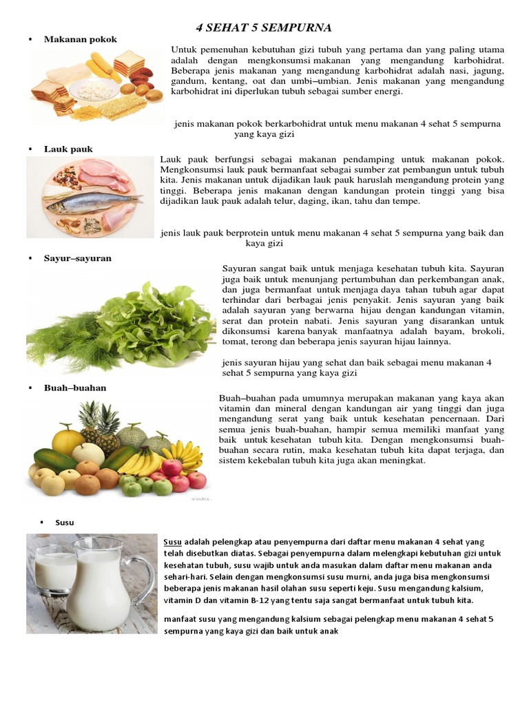 Contoh makanan 4 sehat 5 sempurna. Yang terdiri atas makanan 4 sehat 5 sempurna merupakan makanan sehat yang mencakup berbagai asupan gizi penting bagi tubuh kita. Untuk menyediakan nutrisi ini maka harus ada asupan makanan yang tepat sehubungan dengan kebutuhan manusia yang diperlukan. Makanan atau minuman empat sehat. Manfaat gizi makanan 4 sehat 5 sempurna akan membuat tubuh kita sehat kuat dan terhindar dari penyakit. Makanan 4 sehat 5 sempurna adalah makanan yang mengandung 4 sumber nutrisi yaitu makanan pokok lauk pauk sayur sayuran buah buahan dan disempurnakan dengan susu. 4 sehat 5 sempurna adalah makanan yang dibutuhkan oleh manusia di segala usia.