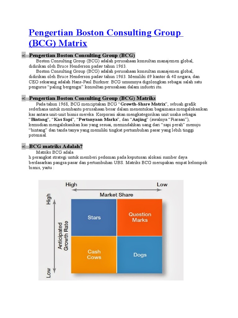 Henderson untuk membantu perusahaan dalam menganalisis serta mengelola unit usaha dan lini produknya. Tujuan matriks boston consulting group. Bruce henderson dari boston consulting group bcg mengembangkan sebuah model untuk mengelola portofolio dari berbagai unit bisnis strategis sbu atau lini produk utama. Bcg adalah kepanjangan dari boston consulting group merupakan perusahaan konsultan manajemen yang didirikan pada tahun 1963 dan memiliki 87 kantor di 45 negara termasuk indonesia. Boston consulting group bcg merupakan perusahaan konsultasi manajemen global yang terkenal dan pernah dinobatkan sebagai pengembang terbaik dari ketiga versi forbes pada tahun 2014. Matriks bcg merupakan salah satu alatteknik perumusan strategi yang memetakan portofolio bisnis.