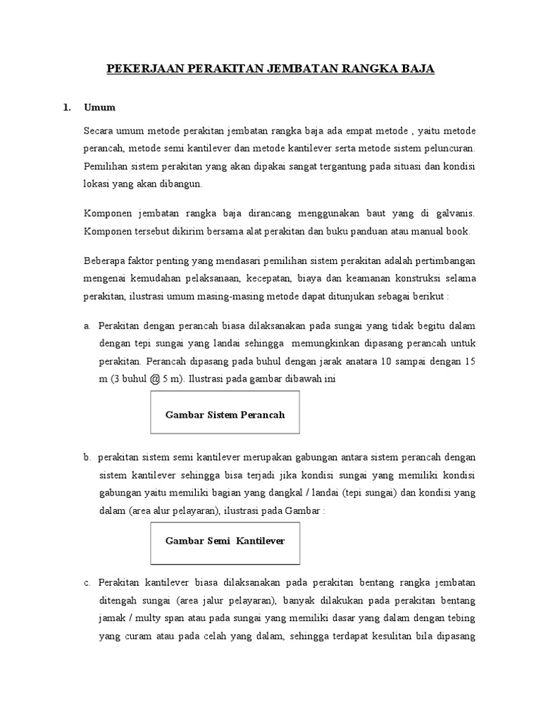 Contoh metode pelaksanaan jembatan rangka baja. Berdasarkan struktur metode pelaksanaan jembatan terdiri dari metode pelaksanaan jembatan beton dan metode pelaksanaan jembatan rangka2. Metode pelaksanaan konstruksi jembatan. Metode pelaksanaan jembatan beton dibedakan menjadi 2 yaitu cast insitu dan precast segmental. Ilm increamental launching method ilm adalah suatu metode erection pada jembatan bentang panjang yang sudah diimplementasikan sejak tahun 1962 yaitu di rio caroni bridge venezuela. Contoh pembangunan jembatan yang menggunakan metode movable scaffolding system. Semi kantilever adalah suatu sistem perakitan jembatan rangka baja yang dilakukan tanpa alat penyanggaperancah tetapi merupakan sistem pemasangan komponen per komponen yang dipasang setempat secara bertahap mulai dari abutment atau pilar hingga posisi akhir abutment atau pilar.