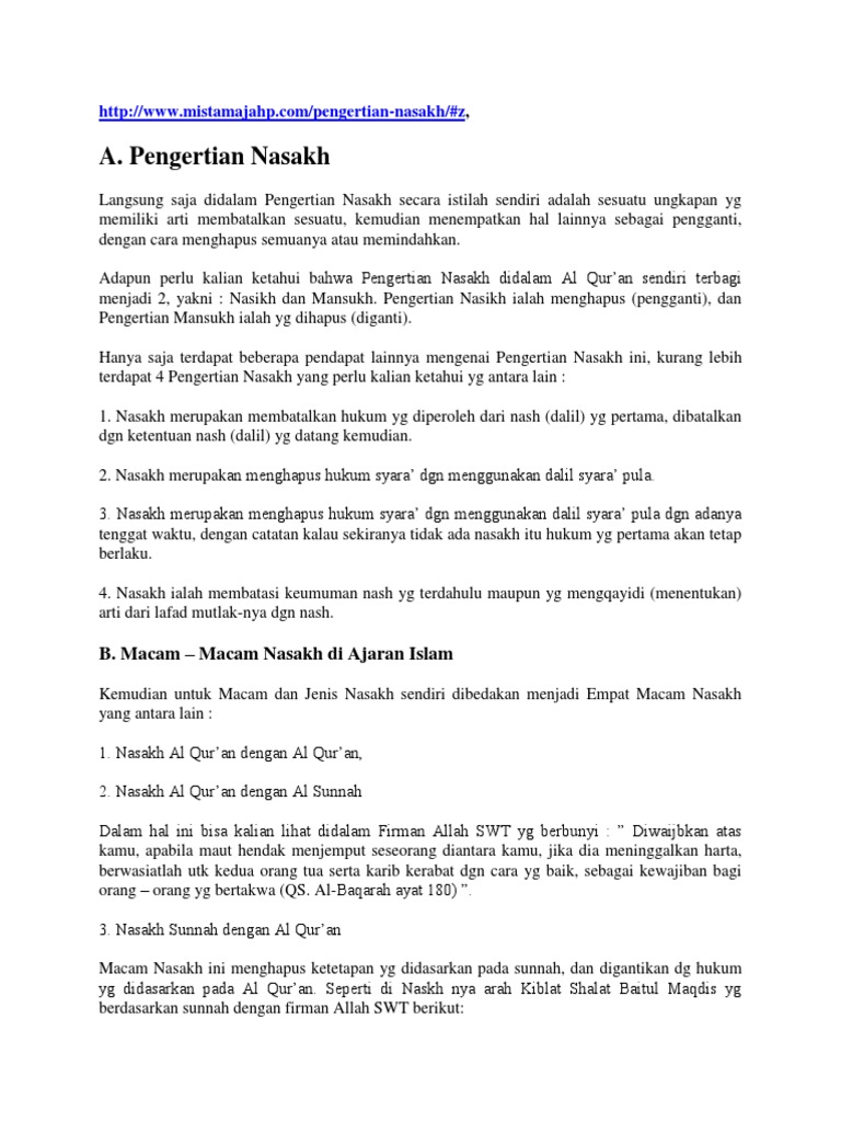 Contoh nasikh dan mansukh. Oleh karena itu nasikh itu mesti ada dan terjadi pada sebagian hokum hokum nasikh itu terjadi pada berita berita. Sebab secara gamblang dapat dijelaskan bahwa haruslah ayat nasikhat yang datang kemudian dari pada ayat mansukhat sebab jelas bahwa tidak mungkin sesuatu yang datang lebih dahulu mengganti sesuatu yang datang kemudian. Turunnya kitab suci al quran tidak terjadi sekaligus tapi beransur ansur dalam waktu 20 tahun lebih. Adapun mutasyabihat yaitu mansukh dalam al quran lafadz yang harus didahulukandan lafadz yang harus di akhirkan itibar contoh contoh sumpah dan sesuatu yang telah kita yakini tetapi tidak di. An nahl101 demikian juga ayat ini juga nyata menunjukkan adanya ayat al quran yang nasikh dan mansukh bukan hanya nasikh saja. Pengertian nasakh dan contoh nasakh merupakan salah satu materi islam yang cukup penting untuk dibahas dan diulas secara lebih dalam karena memang tidak bisa dipungkiri bahwa diluar sana masih banyak para pembaca muslim dan muslimah yang belum cukup memahami tentang materi islam nasakh ini.