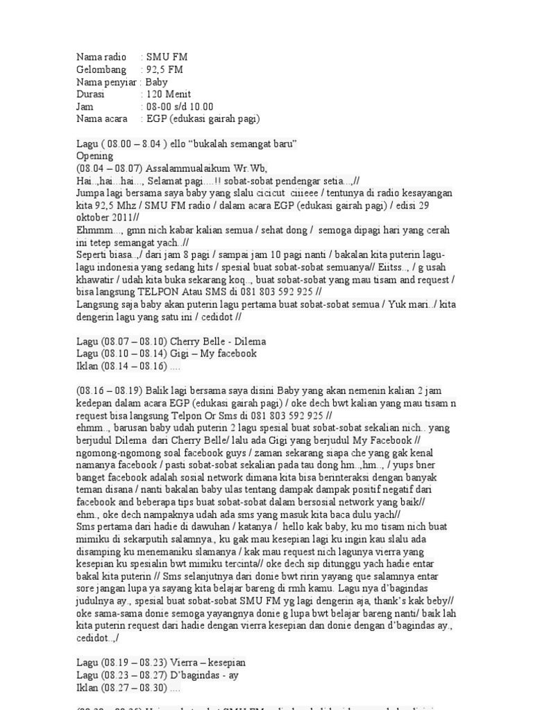 Contoh naskah berita radio bahasa inggris sample radio news scripts cols curfew 2009 wrap fox 6 11 09 note. 0830 0835 wib progam acara. In jurnalistik radio on may 20 2007 at 111 pm. Penulisan naskah untuk disiarkan di radio secara teknis berbeda dengan cara penulisan di media massa cetak. The lead in should only be 1 3 brief sentences to introduce the story to the audience. Berita pagi selamat pagi pendengar mandalla 1078.