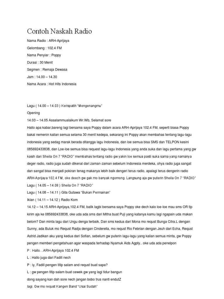 Berikut ini contoh naskah script siaran berita radio lengkap dengan opening pembukaan siarannya. Dalam siaran radio tentunya seorang pembawa acara atau pengisian suara membutuhkan suatu naskah karna semua program telah disusun dan di rangkum kedalam naskah. Naskah siaran radio judul. Pertanian bioindustri berbasis tanaman dan ternak ramah lingkungan bentuk. Naskah berita radio lebih ringkas menggunakan bahasa tutur informal dan menggunakan tanda tanda baca khusus sign posting. Kata kata yang sering kita dengar dari penyiar radio misalnya seratus lima satu koma satu fm station request music atau halo para pforesional muda yang ga profesional muda ga halo.