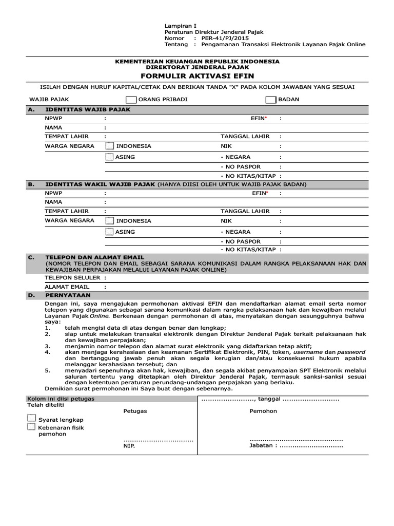 Biasanya saat musim lapor spt akan diberikan langsung bisa ditunggu di tempat agar bisa digunakan untuk efiling. Berdasarkan pasal 2 dari peraturan direktur jenderal perdirjen pajak nomor per 04pj2015 tentang pengamanan transaksi elektronik layanan pajak online wajib pajak diharuskan mengajukan permohonan menggunakan formulir yang formatnya sudah diatur beserta dengan lampiran lampiran sesuai syarat dan disampaikan secara langsung ke kantor pelayanan pajak kpp terdekat untuk mendapatkan efin. Baik via twitter live chat maupun telepon. Daftar informasi yang wajib disediakan dan diinformasikan secara berkala. Kedua cek email yang anda gunakan saat daftar akun efiling djp online. Efin pajak adalah nomor identitas untuk melakukan transaksi perpajakan secara online seperti melaporkan spt efiling dan membayar pajak e billing.