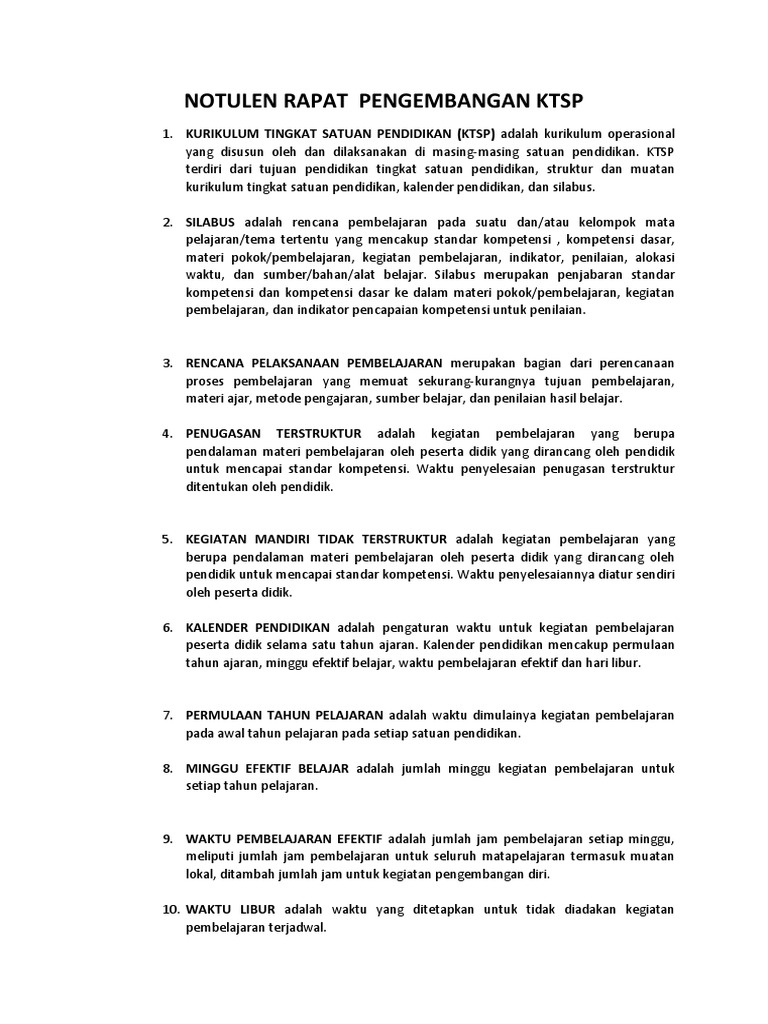 Notulen rapat kurikulum for later. Acara rapat pengembangan ktsp di sekolah memang idealnya melibatkan pihak yang disebutkan di atas. Untuk membentuk tim pengembang kurikulum perlu dimusyawarahkan terlebih dahulu melalui rapat resmi yang dihadiri oleh kepala sekolah seluruh guru mata pelajaran komite sekolahmadrasah atau penyelenggara. Oleh sebab itu maka dalam rapat kurikulum ktsp mesti dihadiri oleh sekretaris selaku notulen kepala selaku pimpinan dan komite selaku pengawas. 0 response to contoh notulen rapat penyusunan kurikulum post a comment silahkan berkomentar dengan baik relevan dengan conten artikel dilarang menyisipkan link hidup. Notulen rapat visi misidocx.