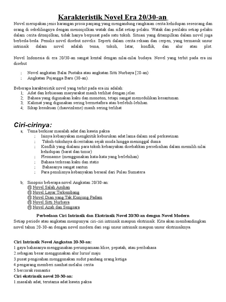 Ciri ciri intrinsik novel angkatan 20 30 an sebagai berikut. Ibu robert meninggal di atas kapal dolfijn dalam perjalanan pulang ke negeri belanda kemudian robert di asuh dan dijadikan anak angkat tuan van reijn seorang saudagar kaya keturunan belanda. Seperti yang telah kalian ketahui bahwa setiap periode sastra ditulis berdasarkan latar belakang tradisi yang terdapat pada masa itu. Tokoh tokohnya diceritakan sejak muda hingga meninggal dunia d. Isinya kebanyakan mengkritik keburukan adat lama dalam soal perkawinan. Angkatan 30 an pujangga baru merupakan angkatan yang berani menampilkan perubahan dari angkatan 20 an.