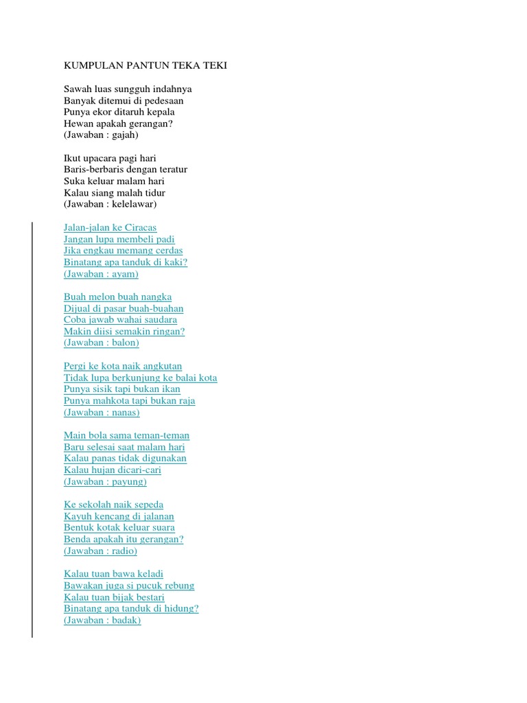 Selain itu makna teka teki di sini bisa dibilang kalau contoh pantun teka teki ini syarat akan ilmu pengetahuan. Serta sajak a b a b pada akhir larik baris pertama dan baris kedua biasanya sebagai tumpuan atau yang biasa disebut sampiran. Baik pantun jenaka pantun nasehat pantun cinta pantun lucu pantun agama atau pantun teka teki semuanya disukai oleh orang. Contoh pantun teka teki kita tentu tidak asing dengan kata pantunadapun pengertian pantun secara umum salah satu jenis karya puisi lama dengan 4 baris dan sajak a b a b di akhir larik baris pertama dan baris kedua biasanya untuk tumpuan sampiran saja dan baris ketiga dan keempat merupakan isi. Teka teki dalam bentuk pantun dapat dijadikan sebagai alat pemicu pikiran yang cukup efektif. Ada banyak macam macam pantun seperti pantun anak anak pantun agama pantun nasehat pantun.