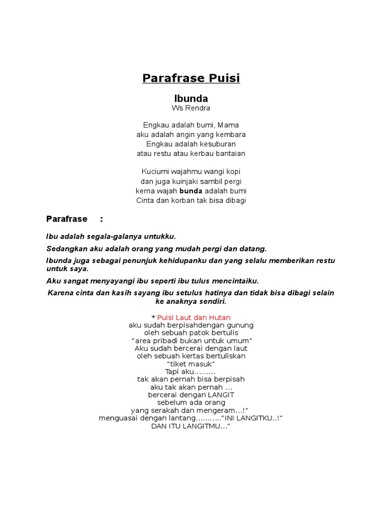 Contoh parafrase puisi pendek. Kamu mesti tahu bahwa mengolah puisi menjadi prosa dinamakan parafrase puisi. Entah apa yang dipikirkan sehingga mengghiraukan begitu saja tukik tukik yang kesepian itu. Demikianlah kumpulan puisi bumi. Parafrase dapat disebut mengungkapkan kembali sebuah puisi dalam format lain namun tidak mengolah makna puisi. Aku ini binatang jalang. Penjelasan sejarah isi surat perintah sebelas maret supersemar.