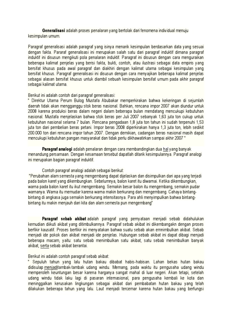 Contoh paragraf generalisasi analogi sebab akibat. Jumlah data atau peristiwa khusus yang dikemukakan harus cukup dan dapat mewakili. Orang yang menggunakan narkoba akan mengalami kondisi mental yang membuatnya terlihat seperti orang aneh atau gila. Generalisasi adalah penalaran induktif dengan cara menarik kesimpulan secara umum berdasarkan sejumlah data. Posted in bahasa indonesia tagged contoh analogi diri contoh analogi diri dengan benda contoh analogi generalisasi contoh analogi sebab akibat contoh analogi tentang alam contoh analogi tentang budaya. Contoh paragraf generalisasi analogi sebab akibat singkat kali ini akan kita bahas berbagai macam contoh paragraf apa sih itu paragraf. Bacalah paragraf sebab akibat berikut dengan saksama.