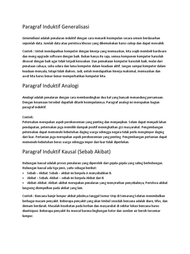 Pada sebuah paragraf biasanya mempunyai suatu susunan yang diawali dengan kalimat utama kemudian akan disusul dengan kalimat pendukung atau penjelasannya. Contoh paragraf induktif pada pembahasan materi kali ini terkait contoh paragraf induktif singkat lingkungan pendidikan kesehatan dan lain sebagainya. Berikut ini contoh contoh dari paragraf generalisasi. Generalisasi adalah penalaran induktif dengan cara menarik kesimpulan secara umum berdasarkan sejumlah data. Dalam sebuah paragraf umumnya memiliki susunan yang diawali dengan kalimat utama kemudian disusul dengan kalimat pendukung atau penjelas. Paragraf jenis ini merupakan kebalikan dari paragraf generalisasi loncatan induktif.