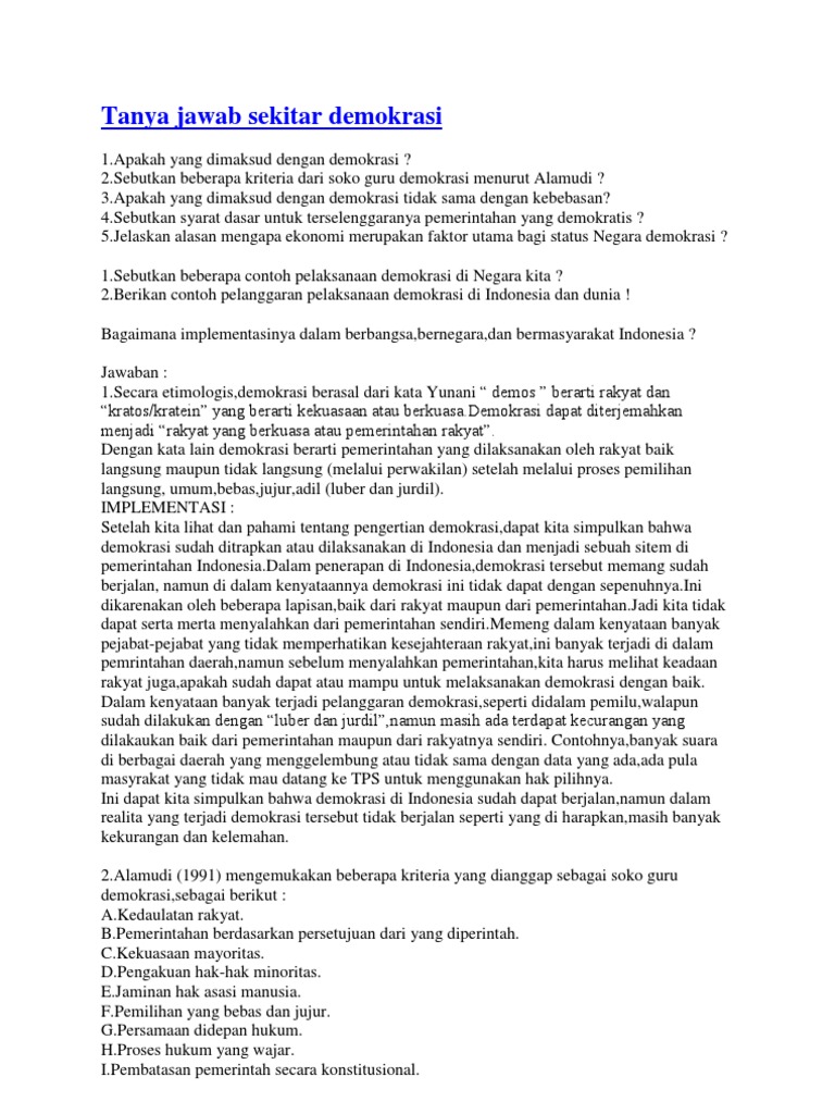 Pada saat itu konstitusi yang berlaku adalah uuds 1950. Contoh pelanggaran pelaksanaan demokrasi di indonesia menjadi salah satu topik yang selalu menarik untuk dibahas. Bersama sama menjaga keamanan dan lingkungan masyarakat sekitar. Demokrasi yang ada di indonesia didalam sistem pemerintahannya indonesia sudah mengalami beberapa kali pergantian sistem demokrasi. Sehingga dapat di simpulkan perkembangan demokrasi di indonesia saat ini beranjak dari indeks nasional tiga aspek di antara proposisi yang dapat dikemukakan sebagai jawaban adalahsejauh ini indonesia relatif sangat berhasil dalam membangun kebebasan sipil dan cukup berhasil dalam membangun lembaga demokrasinamun pada sisi lain relatif tertinggal dalam hal hak hak politik. Demokrasi adalah ideologi bangsa kita indonesia dan dalam penerapan sistem demokrasi kita tidak hanya di tuntut untuk negara saja tetapi juga berdemokrasi dalam lingkungan keluarga sekolah dan masyarakat berikut adalah contoh demokrasi di lingkungan keluarga sekolah masyarakat.