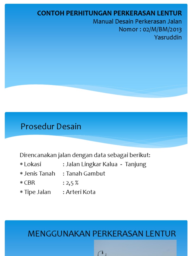 Perkerasan jalan meliputi uraian penjelasan ataupun prinsip prinsip umum tentang perencanaan teknis jalan mengetengahkan standar desain jalan perencanaan teknis untuk flexible. Jalur lalu lintas terdiri dari beberapa lajur lane kenderaanlajur kenderaan yaitu bagian dari jalur lalu lintas yang khusus diperun tukan untuk dilewati oleh suatu rangkaian kenderaan beroda empat atau lebih dalam. Perhitungan tebal lapisan perkerasan untuk merencanakan lapisan tebal perkerasan pada perencanaan konstruksi jalan raya data datanya yaitu. Manual ini akan membantu dalam menyakinkan kecukupan struktural dan kepraktisan konstruksi untuk kondisi beban dan iklim. Komposisi kendaraan awal umur rencana pada tahun 2009. Contoh perhitungan perencanaan perkerasan jalan 71 perhitungan tebal lapisan perkerasan untuk merencanakan lapisan tebal perkerasan pada perencanaan konstruksi jalan raya data datanya yaitu.
