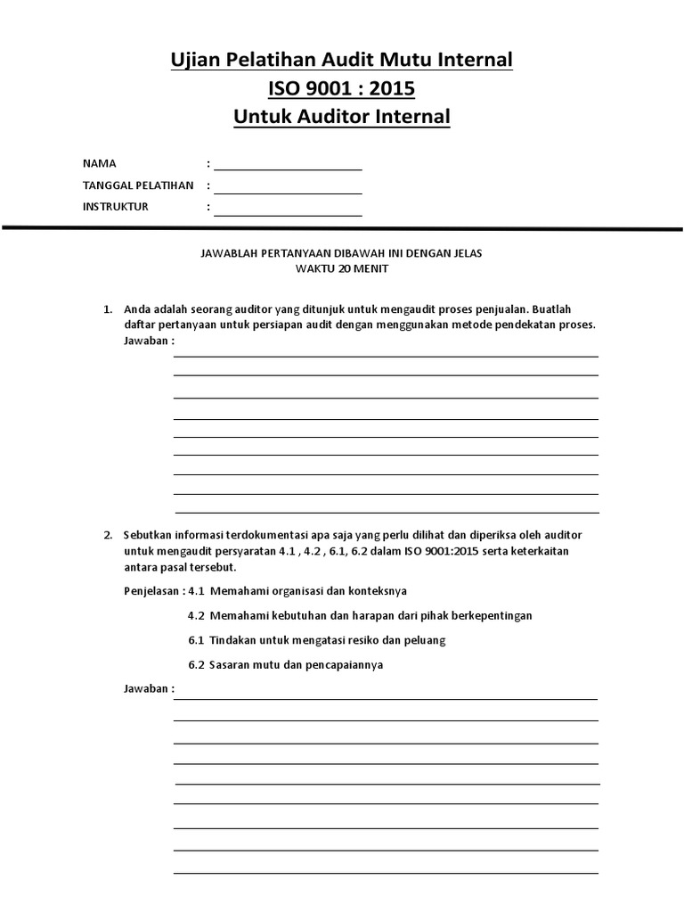 Contoh pertanyaan audit internal iso 9001 2015. Iso 9001 sedang mengalami revisi yang signifikan struktur baru skema penomoran baru persyaratan baru dan penghapusan beberapa persyaratan. Konsultan iso 9001. Contoh checklist audit no item audit item evaluasi catatan auditor. Leadership dan iso 90012015 june 6 2019. Contoh checklist audit iso 9001 versi 2015 bisa di download melalui folider download lihat file no 79 password. Apalagi bila tujuan sertifikasi ditujukan untuk pengelolaan organisasi perusahaan.