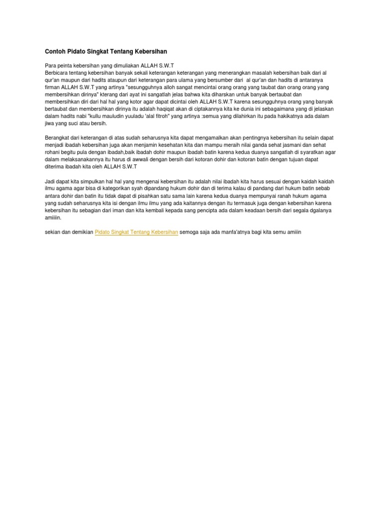 Kebersihan merupakan sebagian dari iman pentingnya menjaga kebersihan baik jasmani ataupun rohani dari lingkungan sekitar. Anda dapat menggunakan pidato ini selama retret sekolah atau bahkan menambahkan kata kata jika masih ada. Semoga bermanfaat sekian dan terima kasih. Pada kesempatan ini kita akan mengupas pidato dengan tema kebersihan. Contoh pidato singkat pidato singkat tentang narkoba. Oleh karena itu lingkungan juga merupakan faktor pendorong keberhasilan proses belajar mengajar di kelas.