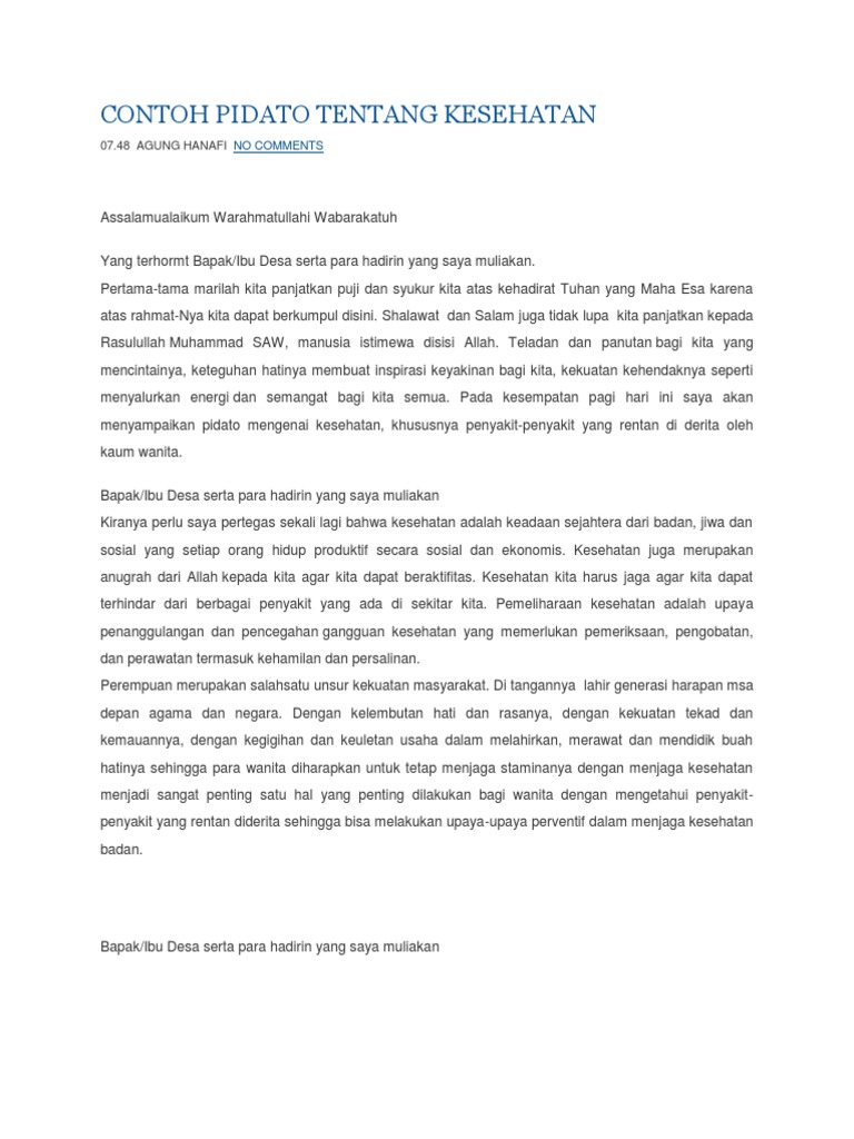 Contoh pidato tentang kesehatan. Contoh pidato di bawah dapat digunakan oleh pelajar sd smp sma atau bahkan karyawan. Demikianlah contoh pidato singkat tentang kesehatan. Contoh pidato bahasa jawa tentang kesehatan sesorah singkat memberikan semangat atau motivasi untuk orang orang sekitar kita akan pentingnya kesehatan bisa dilakukan dengan cara berpidato misalnya berpidato dengan tema kesehatan badan. Demikianlah pembahasan mengenai 25 contoh pidato persuasif perpisahan lingkungan kebersihan disiplin islami kesehatan dan pendidikan semoga dengan adanya ulasan tersebut dapat menambah wawasan dan pengetahuan anda semua terima kasih banyak atas kunjungannya. Pidato tentang kesehatan alangkah baiknya pidato yang berbentuk kata kata saja dapat disampaikan lebih baik dengan memperhatikan ekspresi wajah intonasi suara dan juga tingkah laku. Contoh pidato singkat bahasa inggris tentang kesehatan dan artinya berpidato merupakan hal yang terkadang menegangkan bagi kebanyakan orang.