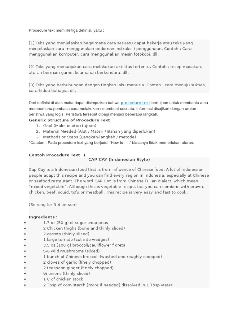 Contoh procedure text makanan. Sekolah bahasa inggris procedure text merupakan sebuah teks yang berisikan tentang cara cara dalam melakukan sesuatu dalam bahasa inggris. Nah itulah penjelasan mengenai contoh procedure text mulai dari pengertian struktur dan unsur kebahasaan. Jika ia apakah text procedure tergolong teks yang susah dipelajari. Berikut ini adalah contoh procedure text mulai dari makanan minuman snack cake benda kerajinan tangan perilaku manusia hingga contoh soal. Selain contoh diatas contoh procedure text ini juga banyak ditemukan dalam berbagai buku menu resep makanan. Teks prosedur kompleks yang tidak memerlukan bahan material.