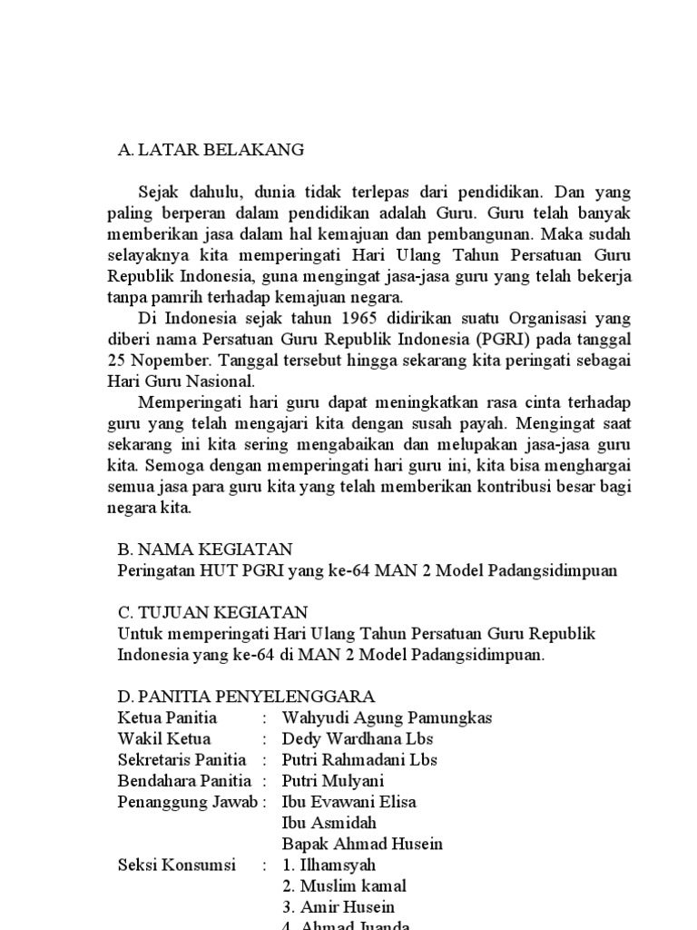 Dibuat secara sistematis jelas dan akuntabel oleh panitia penyelenggara baik di sekolah karang taruna maupun tingkat rt. Seluruh sekolah yang berada disekitar kawasan smkn 1 bojong. Proposal kegiatan hut sekolah. Mengingat akan datangnya hari kemerdekaan ke 74 yang akan jatuh pada tanggal 17 agustus 2019 maka sudah sepatutnya kita sebagai warna negara indonesia mengenang jasa jasa para pahlawan yang telah gugur dalam memperjuangkan kemerdekaan republik indonesia. Proposal tersebut juga bisa menjadi dokumen pengajuan dana ke sekolah. Mengingat akan datangnya hari kemerdekaan ke 74 yang akan jatuh pada tanggal 17 agustus 2019 maka sudah sepatutnya kita sebagai warna negara indonesia mengenang jasa jasa para pahlawan yang telah gugur dalam memperjuangkan kemerdekaan republik indonesia.