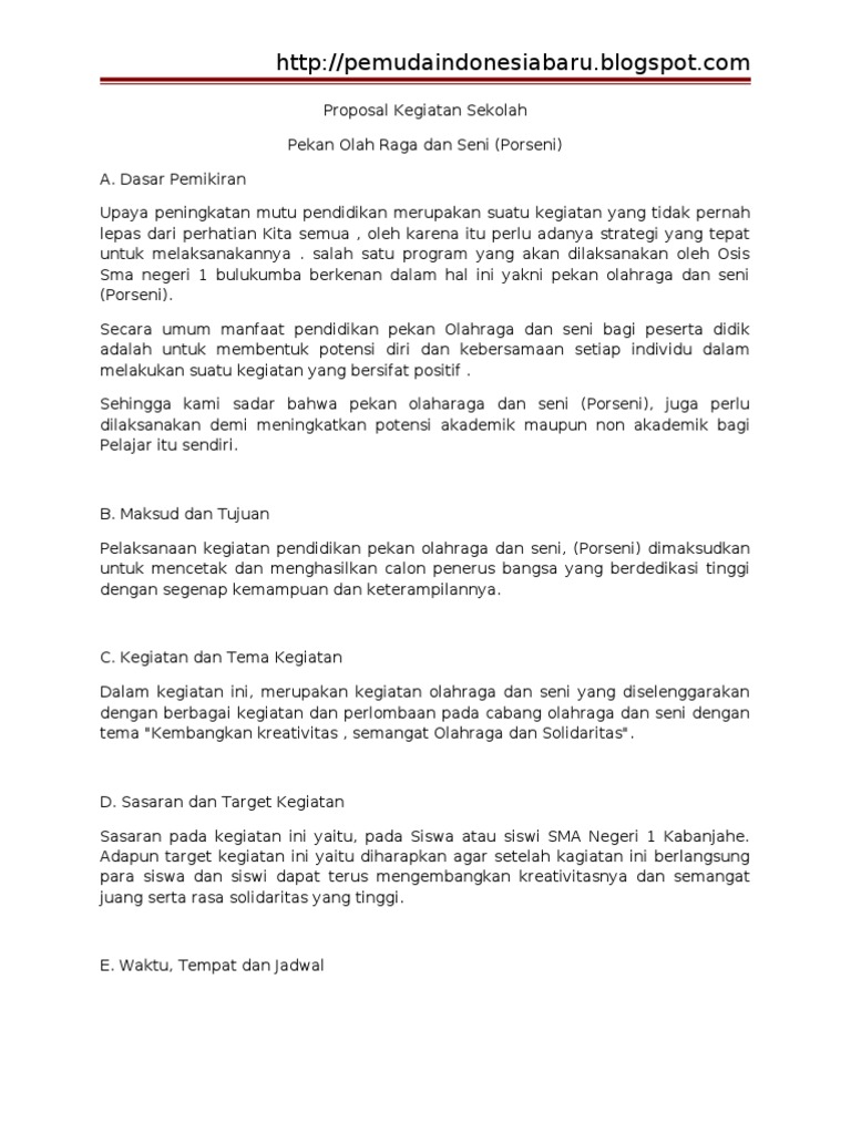 Contoh proposal yang paling sering dibuat tidak hanya dalam kalangan organisasi tetapi dilingkungan sekolah juga sering membuat proposal untuk kegiatan dalam lingkup sekolah seperti proposal kegiatan pentas seni pensi. Kegiatan pekan olahraga antar kelas porak dinas pendidikan dan kebudayaan. Sembilan belas tahun usia smp negeri 2 puhpelem dalam mengabdikan diri di bidang pendidikan merupakan usia yang panjang dan matang bagi sebuah lembaga pendidikan untuk mencapai predikat nama baik dan nama besar. Propsal kegiatan ulang tahun sekolah latar belakang. Kami para pemuda desa prigi selama ini sudah melaksanakan kegiatan tentang kepemudaan seni budaya dan olahraga akan tetapi sarana dan prasarana dan penunjang untuk melakukan kegiatan tersebut kurang mendukung dan memadai dan kami hanya melakukannya sekemampuan kami oleh karena itu dengan adanya proposal kami ini kami para pemuda sangat mengharapkan para dermawan pengusaha dan khususnya. Manusia tidak bisa hidup seorang diri sehingga manusia mau tidak mau harus hidup dalam suatu komunitas atau masyarakat.