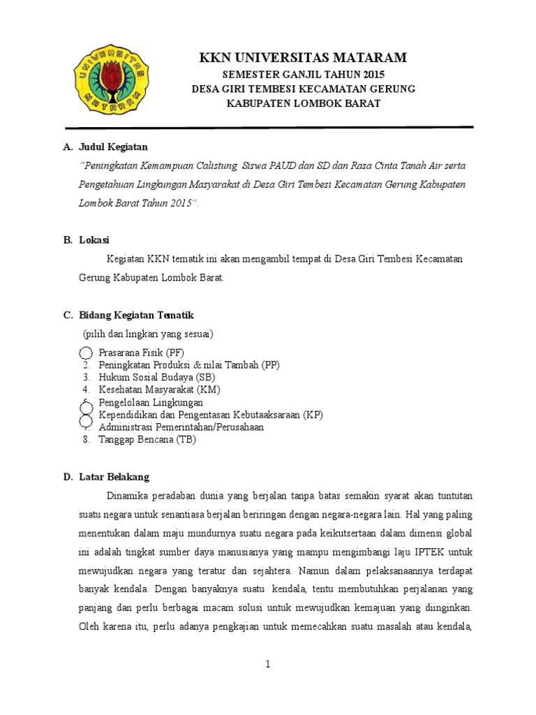 Contoh proposal terbaru untuk kegiatan kkn mahasiswa kkn atau yang juga biasa disebut sebagai kuliah kerja nyata adalah salah satu kegiatan akademik yang bisa diikuti oleh mahasiswa libur semester. Sesuai dengan tema yang di usung mahasiswa kkn tematik universitas mataram tahun akademik 20122013 yaitu mengenai pembimbingan pembukuan pada industri tahu tempe di kekalik gerisak kota mataram. Kkn merupakan kegiatan mahasiswa sebagai salah satu bentuk pengabdian. Presentasi proposal dan revisi usulan kkn tematik. Kelurahan sebagai satuan terkecil pemerintahan setingkat desa dibentuk berdasarkan peraturan pemerintah nomor 73 tahun 2005 tentang kelurahan sebagai peraturan pelaksanaan dari undang undang nomor 32 tahun 2004 tentang. Kkn merupakan salah satu kegiatan yang akan di jumpai oleh mahasiswa.