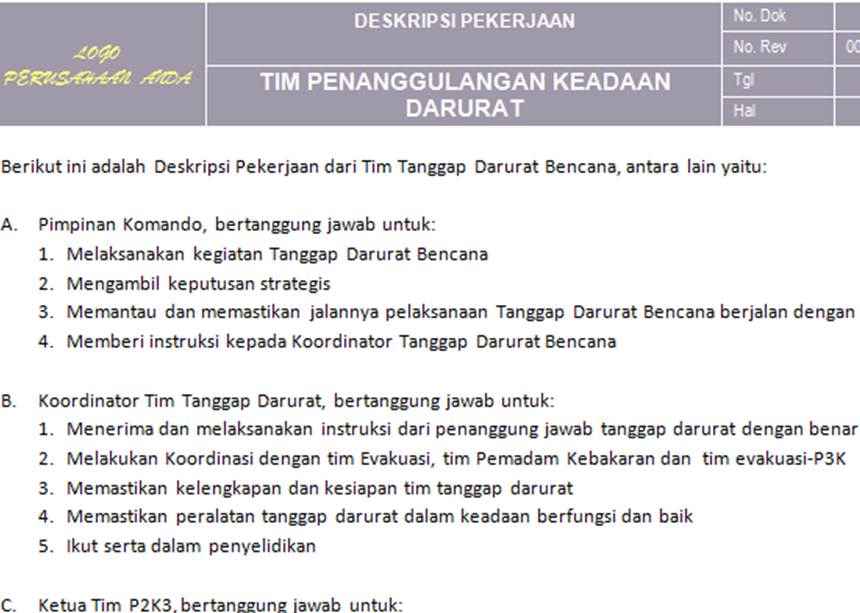 Ketua tim tanggap darurat bertanggung jawab untuk menyusun prosedur kesiagaan dan tanggap darurat untuk keadaan gempa bumi. Blog ini merupakan media informasi yang ditujukan untuk membantu para pegiat k3 dalam membangun k3 di tempat kerja. Berbagai macam prosedur dapat dibuat seperti prosedur dalam pembuatan sebuah produk prosedur pemeriksaan alat dan prosedur tanggap darurat. Menyediakan prosedur tanggap darurat. Definisi unit tanggap darurat ialah unit kerja yang dibentuk secara khusus untuk menanggulangi keadaaan darurat di tempat kerja. Membentuk tim tanggap darurat.