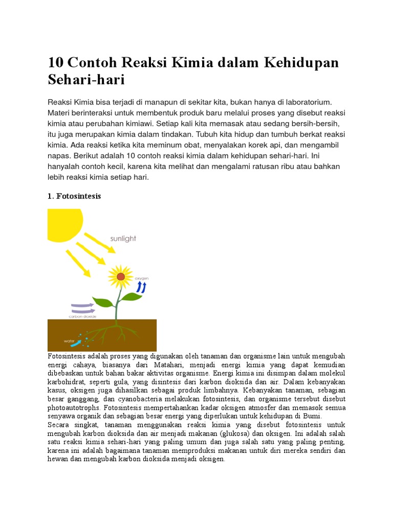 Berikut adalah 10 contoh reaksi kimia dalam kehidupan sehari hari. Contoh reaksi kimia dalam kehidupan sehari hari kimia adalah cabang ilmu yang berkaitan dengan studi tentang komposisi struktur sifat reaksi dan perilaku zat. Contoh reaksi endoterm dalam kehidupan sehari hari adalah fotosintesis dan memasak makanan. Dengan adanya pengembangan lead chamber process pada tahun 1746 dan proses leblanc sehingga memungkinkan adanya produksi asam sulfat dan natrium karbonat dalam jumlah besar maka reaksi kimia dapat diaplikasikan dalam industri. Contoh peristiwa yang melibatkan reaksi reduksi dan oksidasi dalam kehidupan sehari hari meliputi fotosintesis respirasi pembakaran korosi elektrokimia dan baterai peleburan biji logam penyepuhan emas zat pemutih baterai nikel kadmium dan baterai perak oksida. Sebagai contoh senyawa adalah yang paling sering dijumpai yaitu air atau h2o.