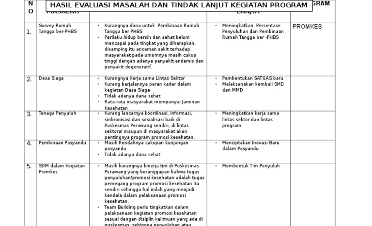 Setelah kita menyebar survey pastinya nanti kita akan mendapatkan hasil yang berupa saran atau kritik dan masukan dari pelanggan disinilah langkah selanjutnya kita menemukan masalah yang harus ditindaklanjuti. Contoh format rencana tindak lanjut rtl di bab 1 akreditasi puskesmas tyanstory. Rencana tindak lanjut pelatihan peningkatan profesionalitas guru sd melalui kkg wilayah 1 sanggabuana 22 25 mei 2013. Tindak lanjut atas monev penanganan pengaduan masyarakat 21 monitoring dan evaluasi penanganan pengaduan masyarakat untuk mewujudkan pelayanan publik yang baik sesuai dengan yang diamatkan undang undang maupun peraturan pemerintah perlu adanya perubahan pada area tertentu. Rencana tindak lanjut hasil evaluasi diri sekolah standar sarana dan prasarana tingkatan eds masalah mendesak rencana tindakan hasil yang dicapai. Berikut ini adalah file tentang contoh format rencana tindak lanjut yang bisa bapakibu unduh secara gratis dengan menekan tombol download pada tautan link di bawah ini.