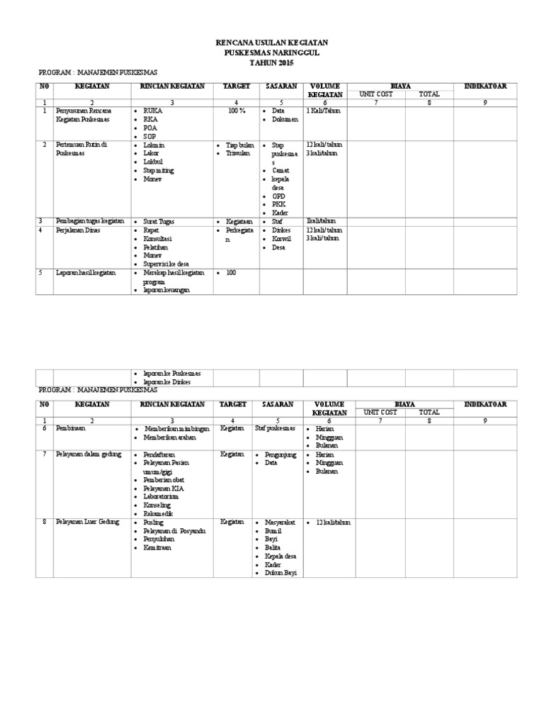 Contoh rencana usulan kegiatan puskesmas. Usulan kegiatan bagan 1. Rencana usulan kegiatan uptd puskesmas jagasatru tahun 2015 dapat. Target kualitatif kuantitatif. Rencana usulan kegiatan puskesmas tembelang tahun 2020 di susun dengan memperhatikan berbagai kebijakan yang berlaku secara nasional maupun daerah sesuai dengan masalah yang ada sebagai hasil dari kajian data dan informasi yang tersedia di puskesmas. Sumber pembiayaan puskesmas selain dari anggaran daerah dau adalah dari pusat yang dialokasikan melalui dinas kesehatan kabupaten. Penyusunan rencana usulan kegiatan ini terdiri dari 2 dua langkah yaitu analisa masalah dan penyusunan rencana usulan kegiatan.