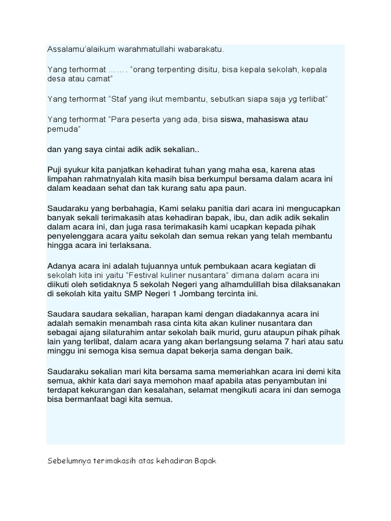 Di karenakan pertumbuhan ekonomi masyarakat yang sudah mencukupi kebutuhan yang lainnya acara ulang tahun sudah biasa untuk di laksanakan. Beliau selalu memberikan sambutan dalam pidato nya dengan jelas tegas dan bahasa yang mengagumkan. Dan berikut adalah contoh naskah mc ulang tahun pernikahan. Contoh kata sambutan sambutan pasti ada disetiap kita menghadiri suatu acara baik itu formal atau nonformal dalam suatu acara banyak sekali kata kata sambutan yang biasanya disampaikan oleh tokoh penting dalam suatu acara tersebut misalkan. Kebanyakan tamu undangan akan datang dengan busana yang semi formal pula. Dengan mempelajari pidato sambutan pada acara ulang tahun anda bisa mempersiapkan sebelunya agar nantinya anda tidak menjadi malu dan tidak menjadi perbincangan orang karena gugup atau salah mengucapkan perkataan dalam.