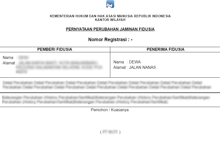 Contoh sertifikat jaminan fidusia. Uu jaminan fidusia ini memberikan kepastian hukum kepada debitur dan kreditur sehingga dengan adanya sertifikat jaminan fidusia ini baik penerima fidusia maupun pemberi. 21 pengertian fidusia dan jaminan fidusia 1. Nanti kreditor akan memperoleh sertifikat jaminan fidusia berirah irah demi keadilan berdasarkan ketuhanan yang maha esa. Tetapi untuk menjamin kepastian hukum bagi kreditor maka dibuat akta yang dibuat oleh notaris dan didaftarkan ke kantor pendaftaran fidusia. Muhammad lutfi alamat. Permohonan akses pendaftaran jaminan fidusia.