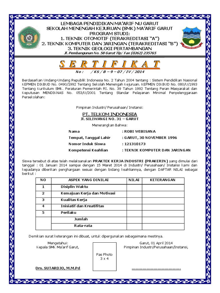 Contoh sertifikat prakerin tkj. Info lengkap tempat pklprakerind. Desain sertifikat pkl prakerin. Academiaedu is a platform for academics to share research papers. Contoh sertifikat prakerin pkl smk prakerin praktek kerja industri adalah kegiatan pendidikan pelatihan dan pembelajaran yang dilaksanakan didunia usaha atau dunia industri yang relevan dengan dengan kompetensi kemampuan siswa sesuai bidangnyadalam pelaksanaannya dilakukan dengan prosedur tertentu bagi siswa yang bertujuan untuk magang disuatu tempat kerja baik dunia usaha maupun. Berbagi ke twitter berbagi ke facebook bagikan ke pinterest. Kirimkan ini lewat email blogthis.