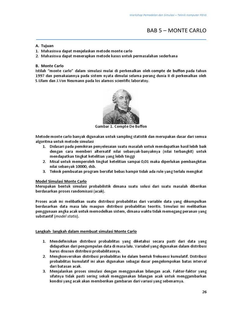 Contoh simulasi monte carlo. Simulasi monte carlo adalah metode yang digunakan dalam memodel dan menganalisa sistem yang mengandung resiko dan ketidak pastian. Dasar simulasi monte carlo adalah percobaan pada unsur peluang atau bersifat probabilistik dengan menggunakan pengambilan sampel secara acak. Penggunaan klasik metode ini adalah untuk mengevaluasi integral definit terutama integral multidimensi dengan syarat dan batasan yang rumit. Contoh 3 simulasi monte carlo dengan sebaran empiris toko roti x memesan sejumlah roti setiap hari. Hal pertama yang harus ditentukanldiketahui sebeiurn melakukan simulasi dengan rnetode simulasi monte carlo adalah sebaran peluang dari peubah yang akan disimulasi. Model simulasi monte carlo jika suatu sistem mengandung elemen yang mengikut sertakan faktor kemungkinan model yang digunakan adalah model monte carlo.