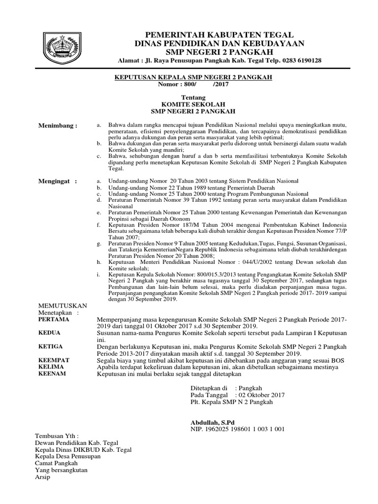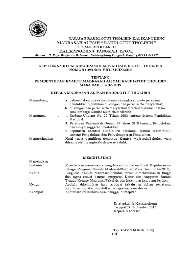Contoh format sk komite sekolah terbaru 2017 komite sekolah merupakan sebuah badan mandiri yang menjadi wadah bagi masyarakat dalam rangka membantu meningkatkan mutu penataan dan efisiensi pengelolaan pendidikan di sebuah satuan pendidikan baik pendidikan pra sekolah sekolah maupun di luar sekolah.