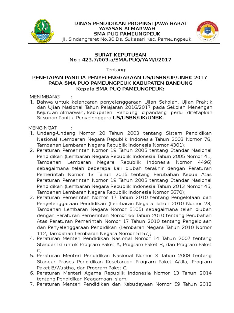 Bagi guru urusan kurikulum ataupun rekan guru yang ditugasi untuk membuat sk pembentukan panitia penyelenggara unbk di tingkat sekolah sebagai penugasan untuk guru berikut ini kami bagikan salah satu contoh sk panitia ujian nasional berbasis komputerunbk tahun pelajaran 20172018 yang dapat di sesuaikan dengan keadaan di sekolah masing masing. Download contoh sk panitia unbk sma tahun 2017 versi 1 download contoh surat keputusan susunan panitia unbk sma tahun 2017 versi 2 contoh sk panitia unbk smamasmk 2017 ini merupakan salah referensi yang baik dan benar sesuai harapan anda bisa digunakan untuk madrasah sk panitia sma smk unbk dengan demikian file tersebut bisa memenuhi dan mengakhiri pencarian di google.