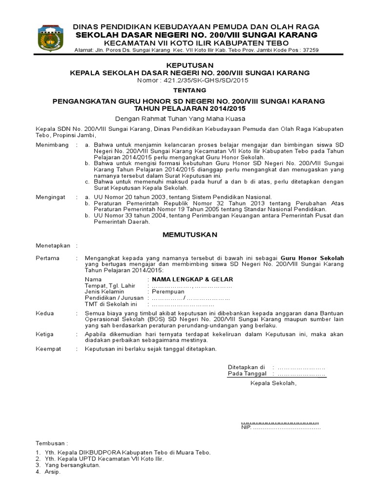 Hal ini agar madrasah swasta mempunyai legalitas hukum yang kuat. Kumpulan contoh surat keputusan sk kepala sekolah lengkap administrasi sekolah sk kepala sekolah surat keputusan atau yang biasa lebih dikenal dengan sk merupakan sebuah surat pernyataan yang dikeluarkan oleh lembaga tertentu formal maupun non formal yang berisi suatu kebijakan atau keputusan tertentu yang berhubungan dengan lembaga tersebut. Nah itulah beberapa contoh surat keputusan sk pengangkatan karyawan tetap nama dan tempat di atas hanyalah sebagai contoh saja bila terdapat kesamaan hanyalah kebetulan semata. Contoh sk pengangkatan guru honor format microsoft word ini mungkin bermanfaat juga bagi anda yang membutuhkan referensi yang berhubungan juga dengan berkas sk guru honorer lainnya seperticontoh sk guru honor doc contoh sk pengangkatan guru honorer smp contoh sk guru tidak tetap contoh sk pengangkatan guru yayasan contoh sk gtt per tahun sk guru honor yayasan contoh sk pengangkatan guru. Ayah bunda dapat download contoh sk pengangkatan guru paud lengkap dengan lampirannya dalam format doc yang dapat diedit dengan mudah. Contoh sk guru honorer terbaru sd smp smasmk tahun 20192020 merupakan sebuah surat keputusan yang diberikan oleh kepala sekolah untuk memenuhi arsip administrasi atau sebagai bukti bagi gtt honor yang akan mengabdi di sekolah tersebutnah bagi anda yang ingin membuat sk namun tidak tahu caranya disini admin kan membagikan conoh sk honorergtt yang dapat anda unduh diakhir postingan ini.