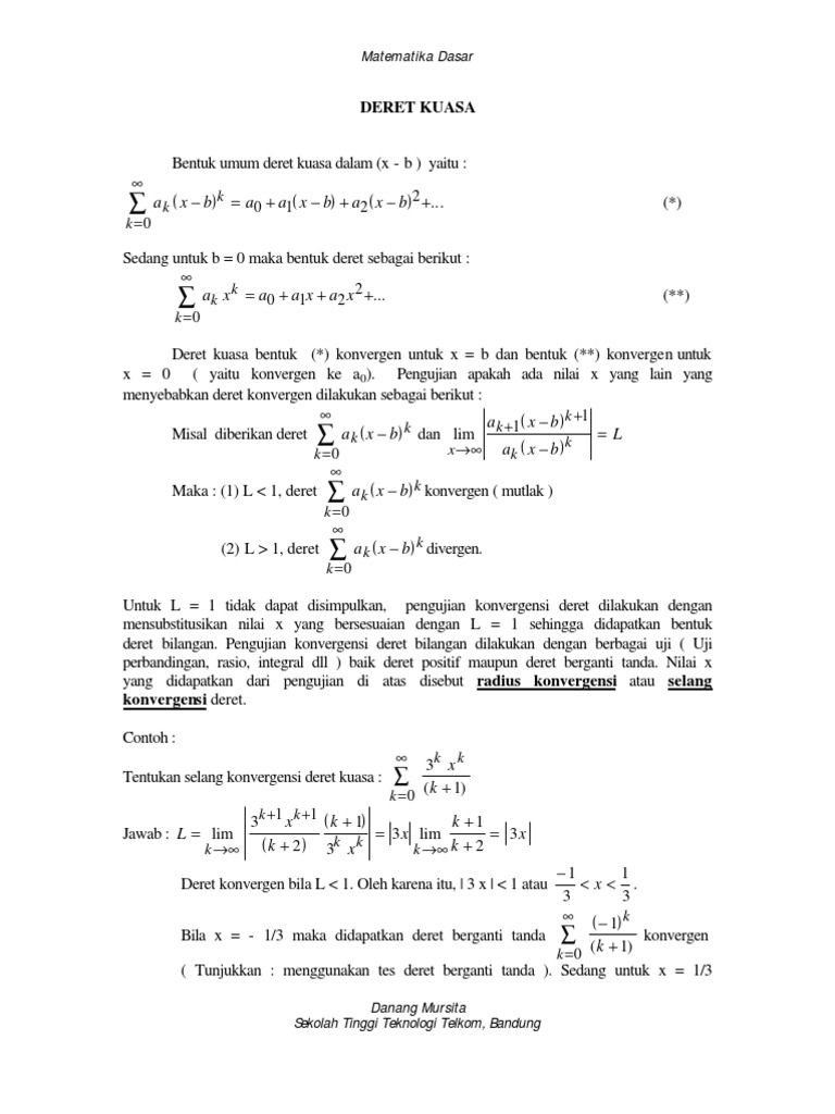 Catatan penting untuk penulisan notasi sigma tanpa batas bawah dan atas. Contoh soal dan pembahasan uji konvergensi deret series convergence tests martha yunanda baris dan deret di bawah ini terdapat beberapa soal mengenai pembuktian uji konvergensi deret atau dikenal dengan series convergence test. Orang bodoh belajar ketika mereka terpaksa. Sum n displaystyle sumn1infty n quote by arthur wellesley orang bijak belajar ketika mereka bisa. Bahan kuliah fi2101 fisika matematik i. Sebagai contoh deret harmonik n 1 n 1 1 n 1.