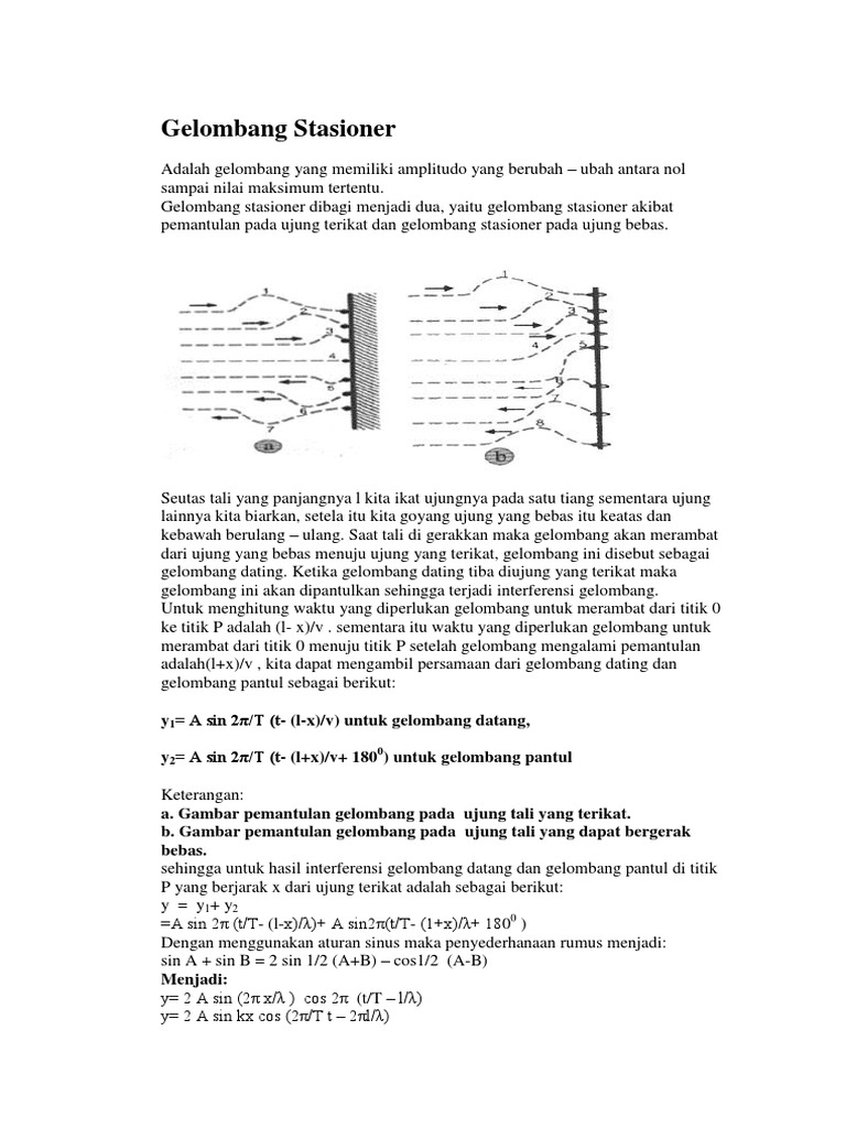 Contoh soal gelombang berjalan dan gelombang stasioner. Contoh soal gelombang stasioner 1. Sebagai contoh gelombang tali yang diikat di salah satu ujungnya lalu ujung yang lain kita ayunkan naik turun. Singkatnya gelombang stasioner yaitu perpaduan ataupun super posisi dari dua gelombang yang identik tetapi berlawanan arah. Gelombang di permukaan air. Terdapat sepotong tali yang panjangnya 5 meter salah satu ujungnya terikat kuat sedangkan ujung yang lainnya digerakkan secara kontinue dengan amplitudo 10 cm dan frekuensi 4 hz. Gelombang berjalan rumus dan contoh soal dalam banyak versi soal ujian nasional fisika pasti keluar yang namanya soal mengenai gelombang berjalan.