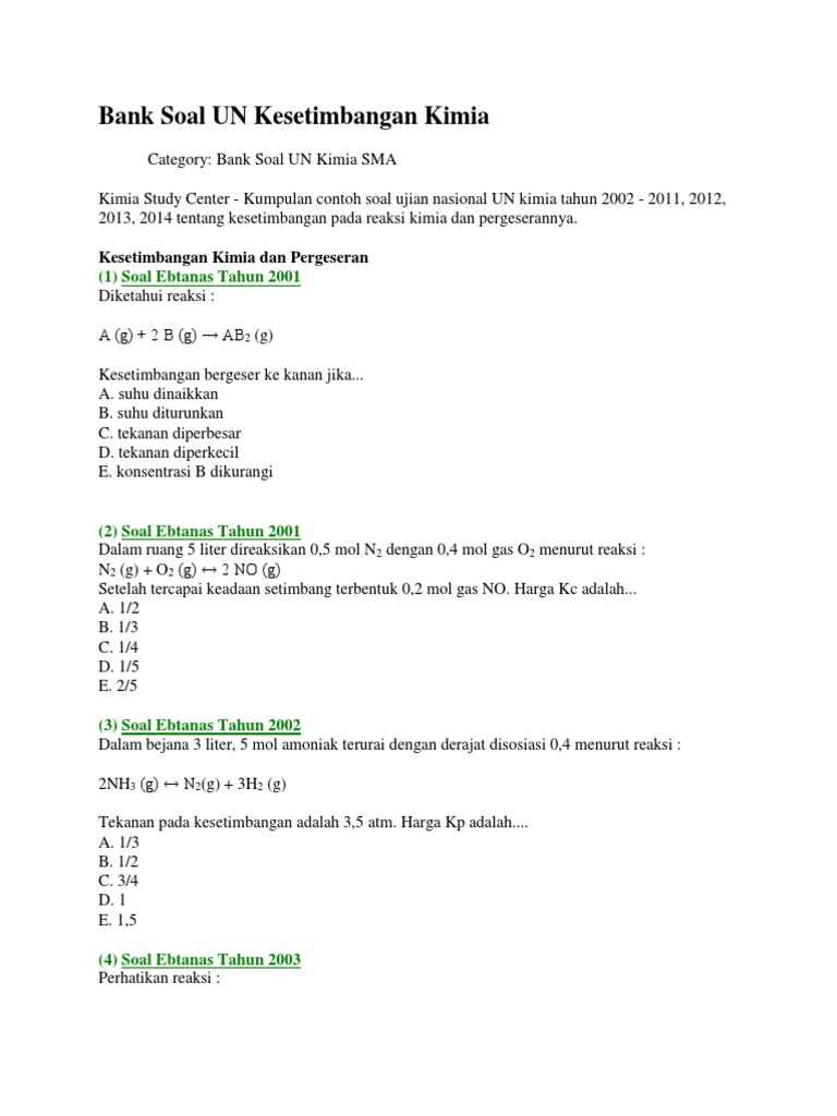 41 50 soal latihan dan pembahasan kesetimbangan kimia. Contoh soal kesetimbangan kimia pilihan ganda dan jawaban beserta pembahasan pada dasarnya istilah kesetimbangan berhubungan dengan apa yang kita sebut keseimbangan kimia akan tetapi keseimbangan ini merupakan keseimbangan mekanikketika suatu reaksi kimia berlangsung dalam sebuah bejana yang mencegah masuk atau keluarnya zat zat yang terlibat dalam reaksi tersebut.