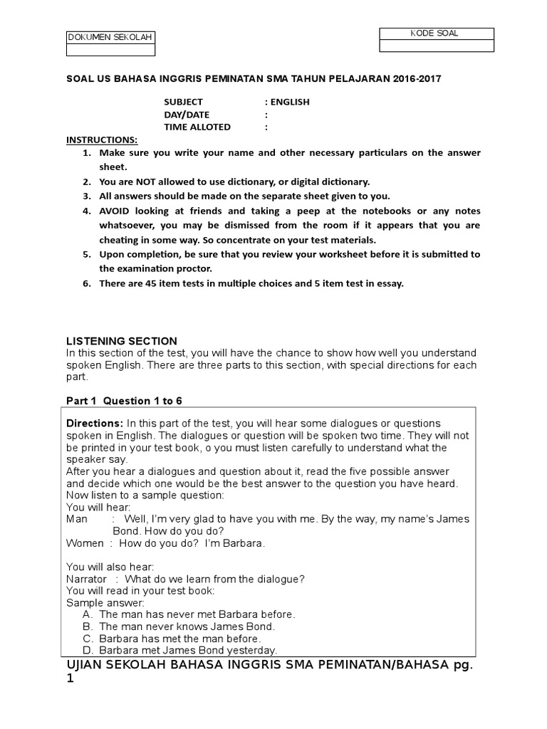 Contoh soal listening bahasa inggris sma. Kumpulan soal speaking untuk sma kelas 1 dalam bahasa inggris bahasa inggris memiliki 4 skill yang wajib untuk kita kuasai dan pahami salah satu dari skill tersebut adalah. Video bahasa inggris ini bukanlah contoh soal listening bahasa inggris sma dan ma akan tetapi soal un sebenarnya pada tahun 2016. Untuk lebih jelasnya berikut pembahasannya. Contoh soal un bahasa inggris sma dan pembahasan. Contoh soal bahasa inggris untuk sd tentang kitchen dan jawaban dalam bahasa inggris 25 contoh soal public places untuk sd dalam bahasa inggris beserta jawabanya posting pada contoh soal english skills listening ditag listening soal latihan. Posted in adjectives adverbs basic grammar listening skills uncategorized verbs vocabulary tagged contoh soal listening bahasa inggris dan jawabannya download listening bahasa inggris dan teksnya download soal listening bahasa inggris sma listening section 1 listening section bahasa inggris listening section detik detik 2015.