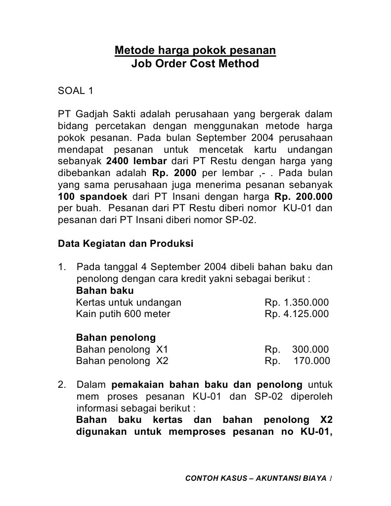 Soal dan jawaban metode harga pokok proses soal nomor 3. Barang dalam proses rp 5475000 persediaan bahan baku rp 5475000 dan jurnal untuk mencatat pemakaian bahan penolong adalah. Untuk menggambarkan penggunaan metode harga pokok pesanan mari pelajari contoh berikut. Metode harga pokok pesanan contoh soal ppt download metoda harga pokok pesanan. Contoh file soal uts lengkap kelas 1 6 sdmi semua mata pelajaran 20162017 berikut ini adalah kumpulan dari berbagi sumber tentang contoh soal akuntansi biaya metode harga pokok proses 2 departemen yang bisa gunakan untuk bank soaldownloadsd dan diunduh secara gratis dengan menekan tombol download. Pt aquana mem produksi air mineral dengan merk fresh.
