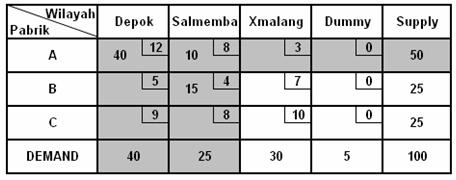 Jika matriks solusi awal menggunakan metode vam dan penyelesaian optimalnya menggunakan stepping stone dapat dilakukan sebagai berikut. Jika sel terisi kurang dari mn 1 maka perlu ditambahkan sel dummy dengan alokasi sebanyak 0 pada sel yang kosong. Berikut ini merupakan masing masing kapasitas pabrik secara berurutan sebesar 90 60 dan 50. Biaya dalam permintaan dan kapasitas dalam unit. Dengan menggunakan metode nwc yang dimulai dari pojok kiri atas saat ini kebutuha semua kota dan kapasitas semua pabrik telah terpenuhi dan habis. Perusahaan makanan ringan ingin mendistribusikan produk terbarunya ke 4 agen yang menjadi pelanggan perusahaan makanan ringan tersebut dan ingin mendistribusikannya ke beberapa kota di indonesia dengan biaya antar kepada para agen di hitung dengan jarak tempat agen tersebut setiap per packnya.