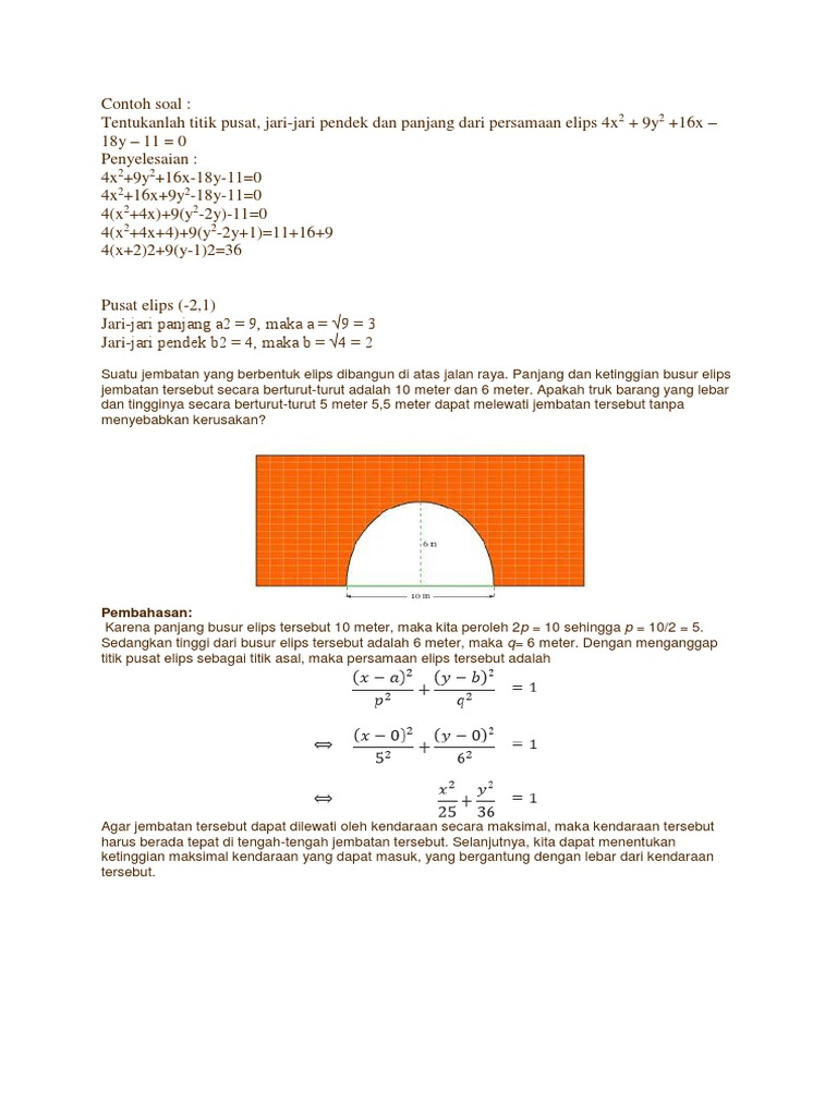 Contoh soal persamaan elips. Persamaan garis singgung elips dengan persamaan x 2 4y 2 4 dan sejajar dengan garis y x 3 adalah. Tentukan titik pusat titik fokus titik puncak panjang sumbu mayor panjang sumbu minor panjang latus rectum persamaan direktris dan nilai eksentrisitasnya dari persamaan elips berikut ini. Lingkaran yang memiliki titik pusat di titik a b dan berjari jari r memiliki persamaan x a2 y b2 r2. A 2 25 b 2 a 2 c 2 à b 2 25 9 16. 4x 2 9y 2 16x 18y 110 4x 2 16x9y 2 18y 110 4x 2 4x9y 2 2y 110 4x 2 4x49y 2 2y111169 4x229y 1236. Soal dan pembahasan elips contoh soal.