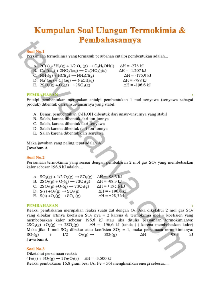Contoh soal perubahan entalpi reaksi dan pembahasannya. Contoh soal termokimia pilihan ganda dan pembahasannya bagian dari ilmu kimia yang mempelajari perubahan kalor atau panas suatu zat yang menyertai suatu reaksi atau proses kimia dan fisika disebut termokimiasecara operasional termokimia berkaitan dengan pengukuran dan pernafsiran perubahan kalor yang menyertai reaksi kimia perubahan keadaan dan pembentukan larutan. Pengertian persamaan reaksi rumus dan contoh soal tahukah anda apa yang dimaksud dengan termokimia. Menentukan h reaksi bila perubahan entalpi pereaksi dan hasil reaksi diketahui menentukan h reaksi berdasarkan reaksi bersusun menentukan h reaksi dengan menganalisis diagram atau siklus reaksi yang. 2hgci 2 aq c 2 o 4 2 aq 2co 2 g hg 2 ci 2 s 2ci aq diketahui dengan mengukur jumlah mol hg 2 ci 2 yang mengendap per liter per menit dan diperoleh data diperoleh data sebagai berikut. Dari data tersebut tentukan orde reaksi terhadap hgci 2 dan c 2 o 4 2 serta orde reaksi keseluruhan. Laju reaksi terhadap.