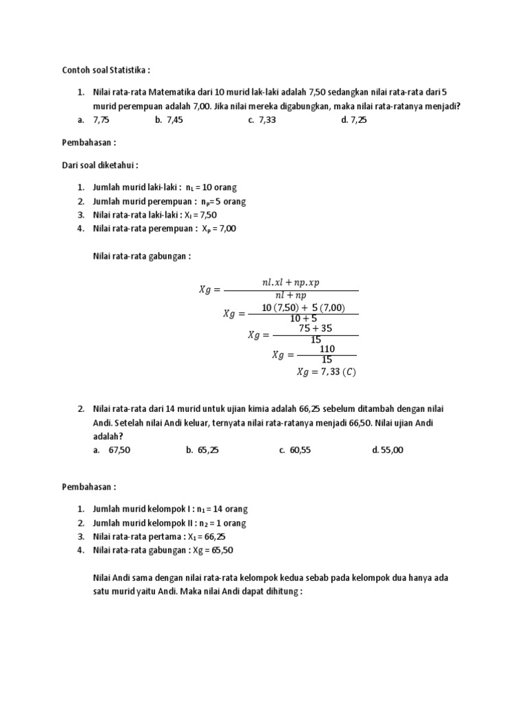 Jawaban rata rata gabungan pada soal di atas adalah 416 terdiri dari n 1 18 dengan rata rata 416 1640 dan n 2 2 yang rata ratanya ditanyakan. Bentuk lain contoh soal rata rata gabungan juga dapat berupa cara mencari rata rata gabungan jika ada tambahan beberapa orang yang masuk dalam kelompok tersebut. 1 nilai rata rata ujian statistika 8 mahasiswa adalah 60 nilai rata rata 6 orang. Rumus dan contoh soal rata rata hitung rata rata gabungan rata rata ukur dan rata rata harmonis. Contoh file soal uts lengkap kelas 1 6 sdmi semua mata pelajaran 20162017 berikut ini adalah kumpulan dari berbagi sumber tentang contoh soal matematika rata rata gabungan yang bisa gunakan untuk bank soaldownloadsd dan diunduh secara gratis dengan menekan tombol download biru dibawah ini. Itulah beberapa cara yang dapat digunakan untuk menghitung nilai rata rata gabungan.