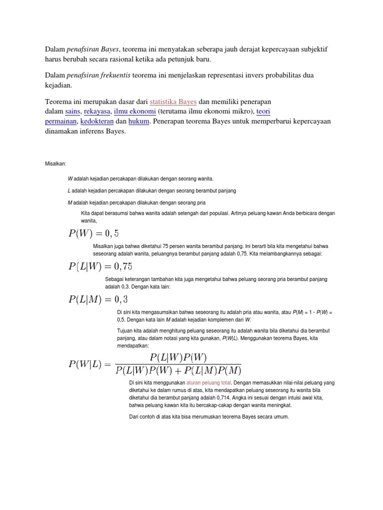 Academiaedu is a platform for academics to share research papers. Bayesian classification didasarkan pada teorema bayes yang memiliki kemampuan klasifikasi serupa decision tree dan neural network. Teorema bayes digunakan untuk menghitung probabilitas terjadinya suatu peistiwa berdasarkan pengaruh yang didapat dari hasil observasi. Teorema bayes digunakan untuk menghitung probabilitas terjadinya suatu peistiwa berdasarkan pengaruh yang didapat dari hasil observasi. Teorema bayes di dunia nyata contoh soal by aansubarkah posted on january 14 2020 di bangku sekolah kita sering punya pertanyaan filosofis tentang kehidupan seperti apa gunanya semua rumus matematika ini yang dibaca saja sulit apalagi dikerjakan. Teorema bayes dikemukakan oleh seorang pendeta presbyterian inggris pada tahun 1763 yang bernama thomas bayes.