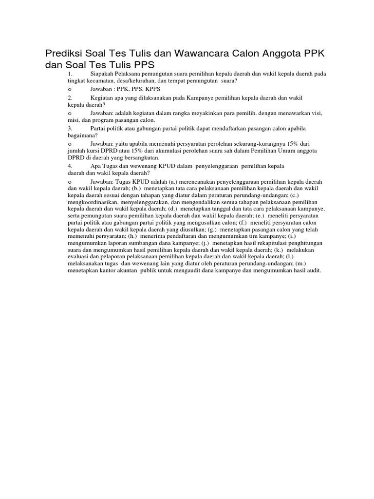Siapakah pelaksana pemungutan suara pemilihan kepala daerah dan wakil kepala daerah pada tingkat kecamatan desakelurahan dan tempat pemungutan suara. Pada artikel contoh soal testing kpu bagian 1 berikut ini saya akan membahas beberapa kisi kisi simulasi atas tes ujian tertulis yang diprediksi sangat kuat bakal jadi pertanyaan pada seleksi penerimaan calon anggota kpu baik kpukip di tingkat provinsi utamanya tes kpu kabupatenkota di seluruh wilayah republik indonesia. Mulai sekarang saya sudah baca baca contoh soal tes tulis ppk pilbup 2020 yang tersedia di internet. Resonansiid salah satu syarat agar peserta lolos menjadi penyelenggara pemilu baik di level kabupaten kecamatan desa hingga luar negeri adalah keakuratan menjawab soal. Prediksi soal tes tertulis seleksi ppk dan pps untuk pilkada 2018 part. Salah seorang pendaftar ppk kamdani menyatakan degdegan meghadapi seleksi.